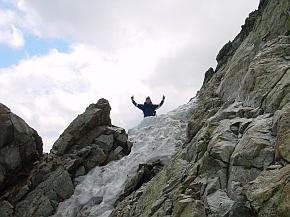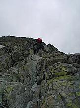 Wir genossen die Aussicht, wobei die Wolken nicht immer gut aussahen. Bald erreichten wir das erste Schneefeld, was uns zu einigen Überlegungen zwang. Wir gingen die Sache ruhig an. Nach dem Schneefeld kam mit Ketten gesicherte "Felskletterei". 14:20 Uhr passierten wir den Sattel. Auf der anderen Seite erwartete uns ein steiles Schneefeld. Einer sehr uner-fahrenen Gruppe zeigten wir die richtige Gangtechnik. |