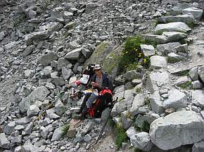 - wir hatten ihn diesmal für uns allein - und wieder herrliche Sicht. Wir genossen die Ruhe und die Sicht, trugen Sonnenschutz auf, unterhielten uns kurz mit einem Italiener (welcher von Morkie Oko kam) und begaben uns ca. 8.45 Uhr zum abwärts führenden Klettersteig. Leider lag der Steig völlig im Schatten. Auch hatten wir mit mächtigen Wind zu kämpfen. An windgeschützter Stelle wurde mal Pause gemacht - 2. Frühstück (30 min). Den oberen See "Czarny Staw pod Rysami".(1583 m) erreichten wir 11.50 Uhr. Weitere 15 min benötigten wir für den Abstieg zum Morskie Oko, dem größten See der Hohen Tatra. Er liegt auf 1395 m. Von weitem glich das gegenüberliegende Ufer einem Badestrand auf Malorca - Menschen über Menschen. Viele Leute nutzten das schöne Wetter. Da der kleinere Teil der Hohen Tatra in Polen liegt, ist der Morskie Oko ein magischer Anziehungs-punkt. Nach 20 min hatten wir die Chata "Morskie Oko" erreicht und gönnten uns eine Eis- und Kaffeepause. |