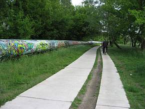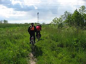 | Nun stellten sich die ersten Pannen ein. Die eine war schnell behoben, aber Kati's Platten hätte man hier gleich mit einer Schlauchreparatur begegnen sollen. Rainer wollte es aber erst in Biesdorf tun. Ziel war der Fortuna-Sportplatz. | |