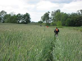 Hier an den Hechtsee Terrassen machten wir Mittagspause, schließlich mussten wir auch unsere Muskel kräftigen. Unser nächstes Ziel war der "Krummer See", ein nordöstliches Stückchen oberhalb Trappenfelde. Auf dem Weg dorthin überraschte uns ein Regenguss. Wir hatten zum Glück einen Baum - also Trinkpause :-). Es blieb der einzige Schauer an diesem Tag. |