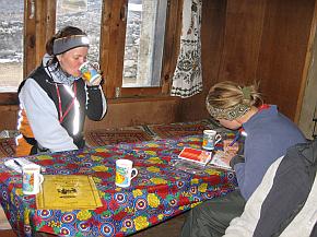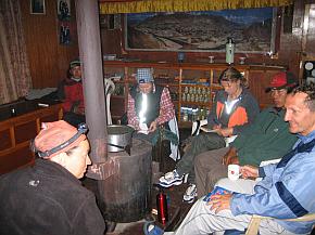 Unsere Entscheidung wurde belohnt. Noch vor dem Dunkelwerden riss der Himmel wieder auf und neue Bergspitzen zeigten sich. In der Dämmerung erreichten wir die feuchten Wiesen von Pheriche und wohlbehalten kamen wir 17.45 Uhr in der "Mountain Guides Lodge" in Pheriche an. Das Quartier war sehr gut. Sogar Duschen wäre möglich gewesen (jedoch nur am Tage, wenn die Leitungen aufgetaut sind). Es war ein langer Tag mit einer reinen Gehzeit von 9 h, ca. 1100 Hm Aufstieg und einer Strecke von ca. 16 km. Bis 21 Uhr saßen Bine und ich noch gemütlich am warmen Ofen und machten unsere Notizen. Bis auf die Sherpa hatten sich alle Anderen schon in ihre Schlafsäcke gekuschelt.