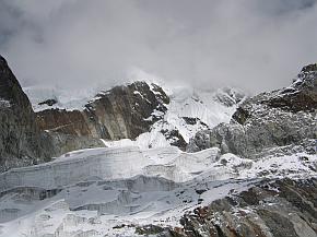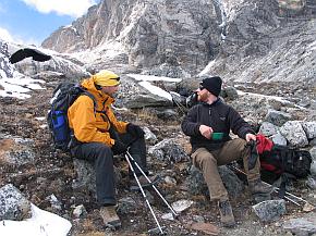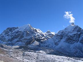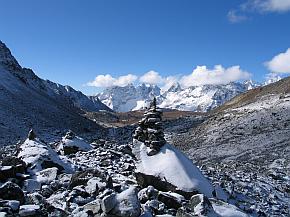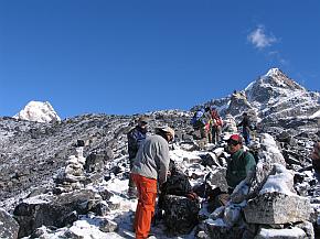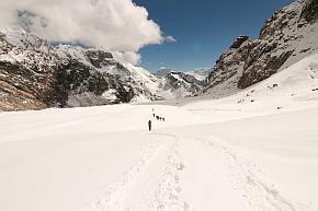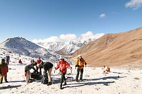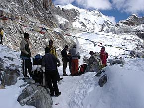 Auf den glatten Steinen lief es sich nicht besonders gut. Dann standen wir vor dem steilen Passanstieg. Er war stark verschneit. Die Tage zuvor war er nicht begehbar gewesen. Welch ein Glück für uns, dass wir nicht umdrehen mussten; Spuren waren schon getrampelt. Hier lief es sich besser als auf dem Geröllfeld, nur kam hier der Anstieg dazu. 10.30 Uhr  schlugen wir am Cho La Pass an. Kerstin fiel es sehr schwer, Aber auch sie schaffte es und betrat den Pass mit strahlenden Augen. Zur Stärkung wurden uns Eier und Tibetan Bread gereicht. Ca. 11.15 Uhr setzten wir unsere Wanderung fort. Anfangs gingen wir über ein großes, fast ebenes Schnee-feld, dann ging es steil über Felsen auf 4850 m runter und vor uns lag wieder ein Hochplateau. Kurz nach 13 Uhr setzte leichter Schneefall ein, der Himmel verdichtete sich mit grauen Wolken. 13.15 Uhr kehrten wir  in die "Green Village" Lodge in Leisyasa (4860 m) ein und stärkten uns mit Tee, Suppe und Toblerone :-) Das Wetter hatte sich mächtig verschlechtert. Trotzdem entschieden wir uns bis nach Dughla (4620 m) zu laufen. Also gingen wir 14 Uhr weiter, ca. 150 Hm runter und dann stetig bergan auf ca. 4870 m, bis es dann endlich doch dauerhaft bergab ging. Im Nebeldunst konnte man den Gletschersee Chola Tsho (4590 m) sowie das Ende der Gletscherzunge sehen. Zügig gingen wir bis Dughla weiter.