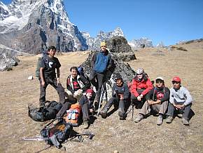 7. Tag (Do 29.10.): Zimmertemperatur um 6 Uhr beträgt 3,2 °C. So gegen 9 Uhr starteten wir unsere heutige Etappe nach Lobuche. Wir liefen über den Gebirgskamm, der Dingboche und Pheriche trennt und hatten dabei einen schönen Blick auf Pheriche. Nach einer reichlichen Stunde machten wir eine kurze Rast. In der Sonne war es schön warm und beim Laufen merkten wir, durch unsere Rucksäcke, den kalten Rückenwind kaum. |