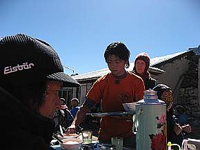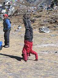 | 14 Uhr bezogen wir unsere Zimmer in der "National Park Lodge" in Lobuche (4910 m) und tranken anschließend Tee. Im Gastraum war es kalt und es roch extrem nach Diesel oder Petroleum. Von dem permanent anhaltenden Geruch bekam ich leichte Kopfschmerzen. Nach der Teepause gingen wir noch ein Stück hinauf zur Gletscherkante (ca. 100 Hm) Der kalte Wind blies uns um die Nasen. | |