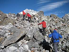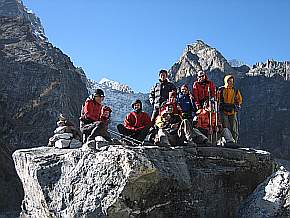 Gegen 11.15 Uhr erreichten wir Dughla (4620 m). Es waren viele "Trekker" unterwegs. Hier ist der Schnittpunkt zweier Haupt-trekkingrouten. (Vor 3 Jahren kamen wir hier vom Cho La Pass vorbei) In Dughla aßen wir Mittag, weil es bis Lobuche keinen weiteren Ort mehr gibt. Eine Stunde später setzten wir unseren Marsch fort. Ein steiler Weg führte uns hinauf zum Thokla Pass (4830 m), wo sich der Sherpa-Friedhof, zum Gedenken an die bei Expeditionen verunglückten Sherpa, befindet. Nach einer kurzen Pause in der wärmenden Sonne ging es weiter. Nach ca. 30 min eröffnete sich für uns das Khumbu-Glacier-Tal und wir bekamen vom Pomo Ri bis Nuptse ein schönes Panorama zu sehen. |