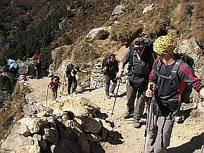 Bis Mong (3975 m) war uns der Weg bekannt. Hier aßen wir wieder im gleichen Restaurant (Mountain View Lodge) zu Mittag. Nach 1,5 h setzten wir unseren Weg fort. Unterwegs zeigte uns Dawa einen Vogel, dessen Flügelunterseiten rot waren. Leider verschwand er zu schnell. Wenig später bekamen wir das dazugehörige Weibchen zu sehen. Dawa meinte, es sei ein heiliger Vogel. Auf der anderen Flußseite konnten wir schon Phortse sehen. |