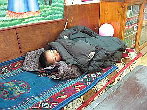 4. Tag (Mo 26.10.): Für 7:30 Uhr war Frühstück angesetzt. Da ich schon 6 Uhr wach war wollte ich mich waschen gehen. Leider musste ich feststellen, dass meine Tür von außen verriegelt war. 15 min später hörte ich draußen Stimmen und der Chef öffnete mir dann die Tür. ca. 9 Uhr starteten wir unsere Tour. Da Rüdi nun erkältet war, ging es erst einmal zur Apotheke. So nutzten wir auch gleich die Gelegenheit, Gebetsfahnen für die Puja zu kaufen. |