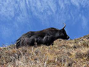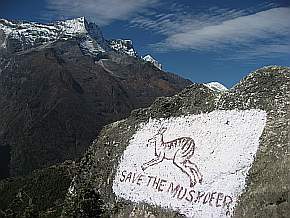 | Nach dem Museumsbesuch stiegen wir den neuen Weg zum Everest View Hotel hinauf. Steinbilder wiesen auf die vom aussterben bedrohten Tiere hin. Vom weitem hörten wir das laute Niesen und Husten eines Yaks (es schien erkältet zu sein) | |