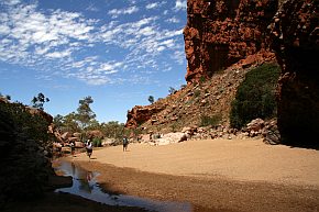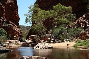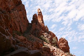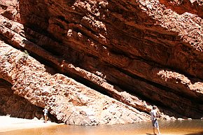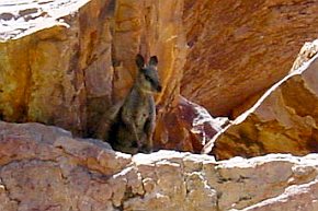 | Simpson Gap: Die faszinierende Schlucht gehört zu den größten Attraktionen in der unmittelbaren Nähe von Alice Springs. Das Bachbett des Roe Creek hat sich im Laufe von Jahrtausenden durch immer wiederkehrende Hochwasserfluten tief in die Quarzfelsen der Rungutjiba Ridge gegraben. Rund um Simpsons Gap gibt es ausgezeichnete Wandermöglichkeiten. Mit etwas Glück können hier die schwarzfüßigen Fellswallabies (Black Footed Rock Wallabies) beobachtet werden, die sich im Bereich der Schlucht angesiedelt haben. Am Parkeingang gibt es ein kleines Visitor Centre mit Informationen über die markierten Wanderwege, Flora und Fauna. |